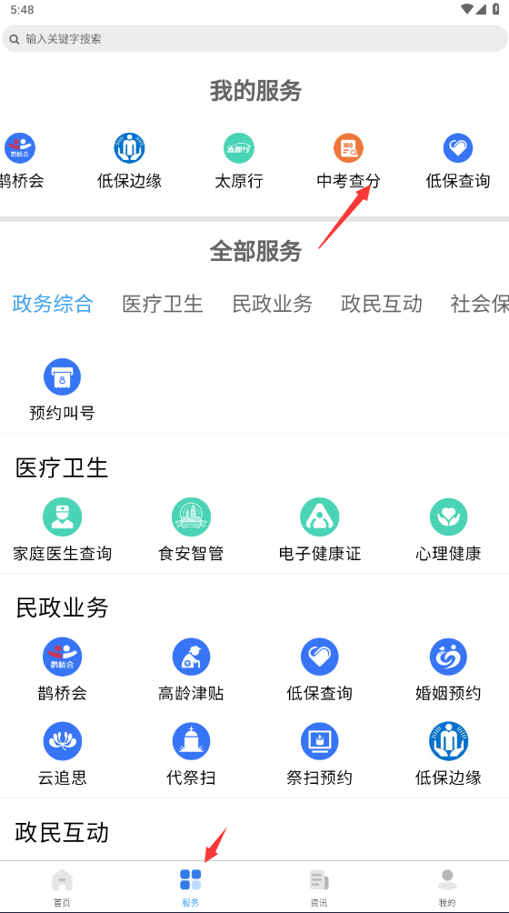 1、下载最新版本的我的太原app,打开点击服务板块的中考查分