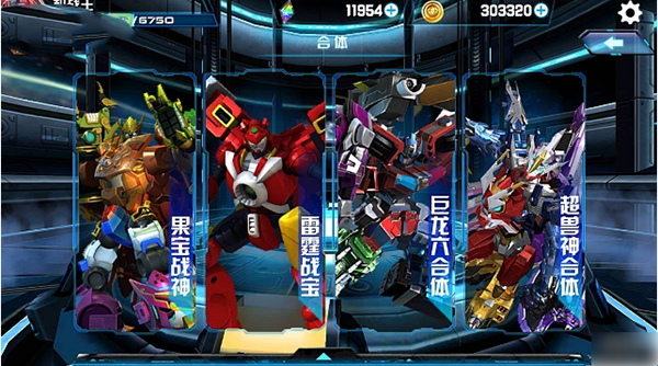 现在游戏中提供的合体机甲共有4款,分别是来自《果宝特攻》世界的果宝战神、《快乐酷宝》世界的雷霆战宝、《钢铁飞龙》世界的巨龙六合体、《超兽武装》世界的超兽神合体。