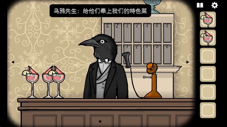 3、首先进入到前台,边上的门去往厨房。前台的五杯“鲜虾鸡尾酒”拿走(这丧心病狂的口味……)。乌鸦先生的时候他会说:“欢迎客人们的到来,周到体贴地为他们进行服务。”