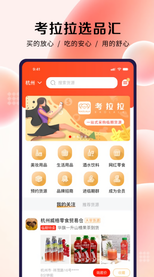 考拉拉是一款临期商品采购平台,软件内拥有海量临期产品,价格都很实惠,商品种类齐全,软件内支持一键搜索商品功能,数百种临期食品货源让你轻松找。更提供高效的仓储配送服务,为您打造省心省钱、安全可靠的线上找货源平台。需要的用户千万不要错过!
