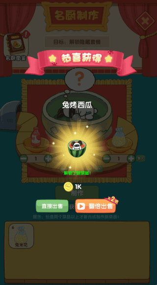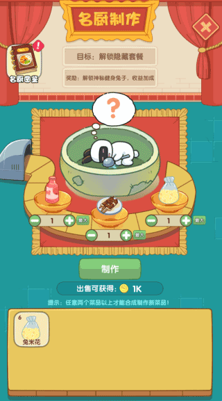 6、甚至当你到达了一定等级还会开启名厨制作模式,来通过三种不一样的菜品进行组合便能获得超高价值的招牌菜!而且当你完成到一定数量的名厨菜品后还能解锁非常可爱的其他兔兔哦;
