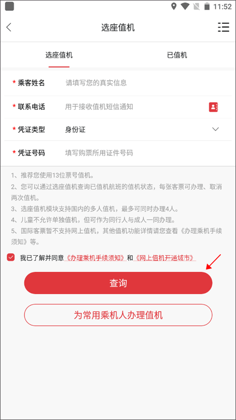 2、然后填写乘客姓名、联系电话、凭证号码,勾选“我已了解并同意……”,点击查询按钮,选择自己想要的座位确定即可。