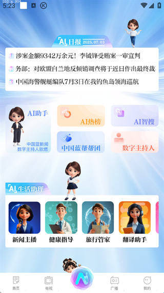 4、全新AI频道,集合AI助手、中国蓝帮帮团、AI数字人、AI搜索、智媒果AI创作,有机整合,智能服务质效大提升。