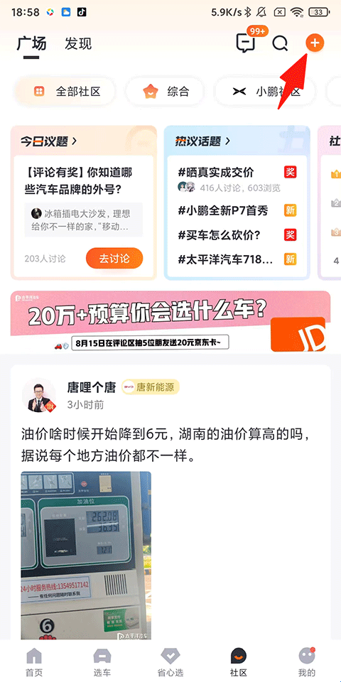 1、打开太平洋汽车APP,在社区页点击右上角的添加按钮;