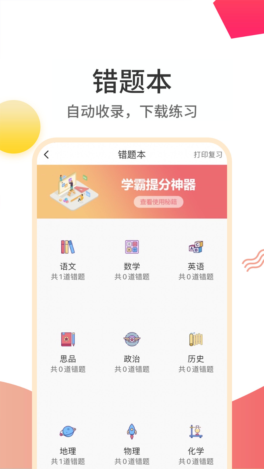4、错题本,按照科目分类显示,用户可以快速查看自己做错的题目,重复练习;