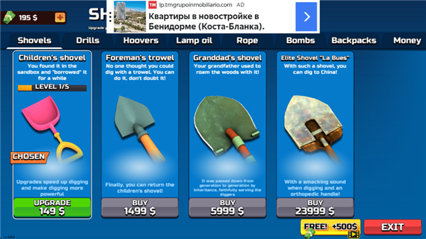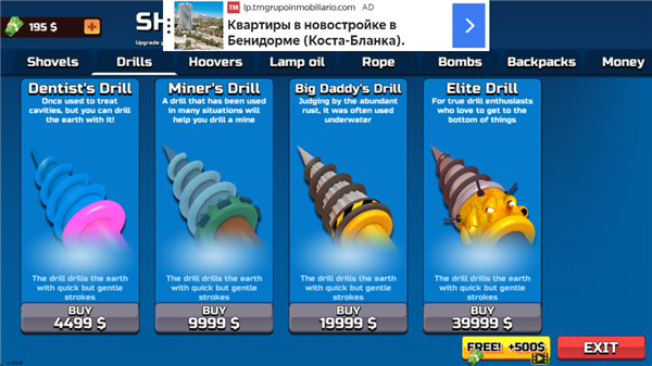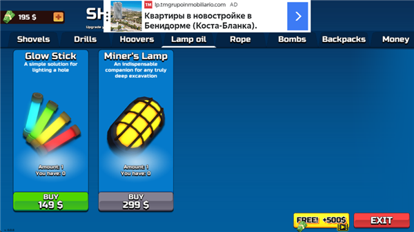 3、进入游戏只有基础工,在收集材料的过程中不断升级你的装备,购买先进的装备让挖宝更有效率。