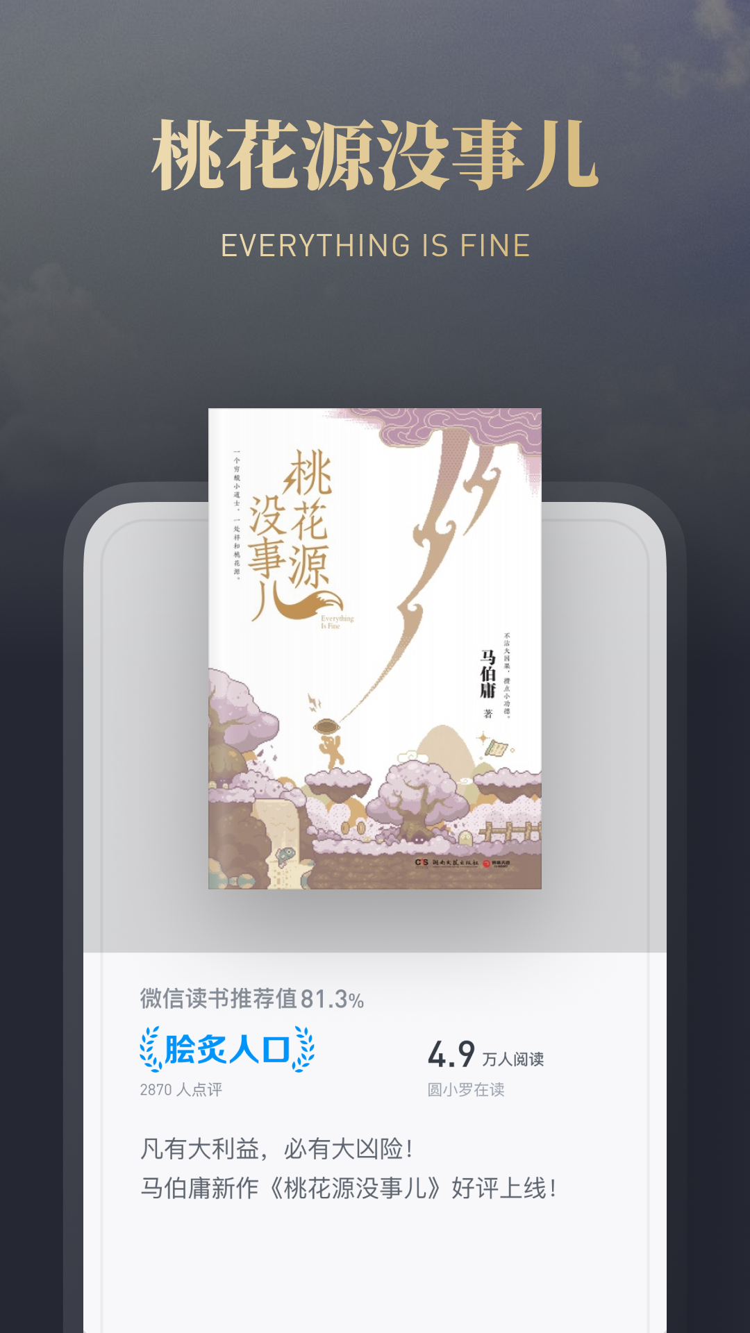 微信读书是一款由腾讯微信官方打造的免费手机阅读神器。用户们在使用微信读书最新版本时,只要是新设备,新手机号即可获取免费的30天阅读时长。微信读书app里像小说、散文、历史、哲学、科幻等多种题材应有尽有。同时还可以智能推荐适合你口味的书,告别盲目找书,每一个推荐都能准确戳中你的喜好。