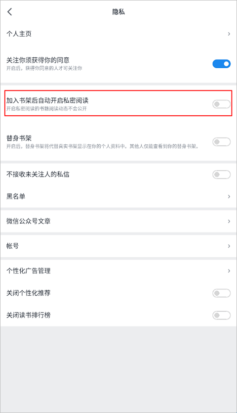 3、在隐私界面点击“私密阅读”右侧的开关即可进行设置啦,还可以通过设置“替身书架”来提升你的阅读体验!