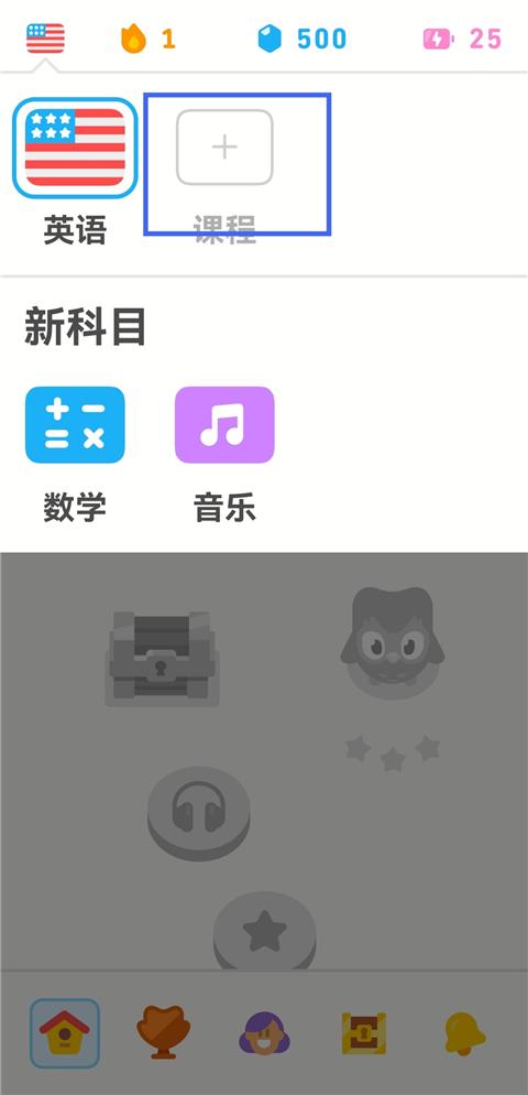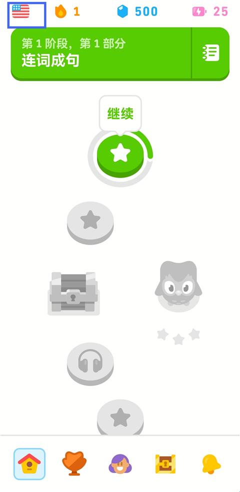 1、在多邻国首页面,点击左上角国旗图标。
