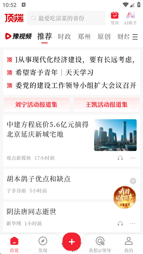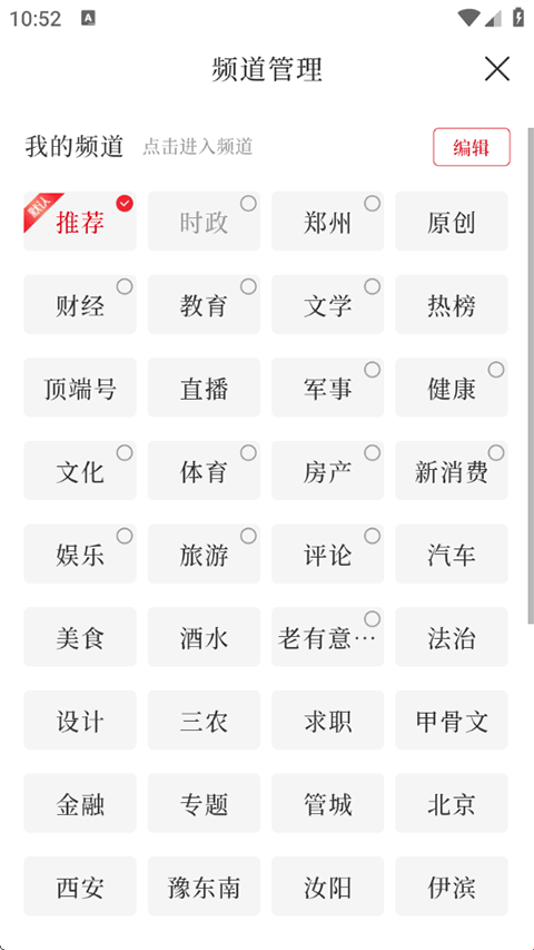 设有郑州、时政、经济、短视频、直播等频道,可按需随时切换