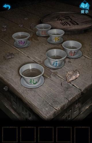 6、点击院子中间的桌子,将【香灰水】倒入茶杯,得到线索:绿色“礼”、蓝色“乐”、红色“射”、黄色“书”、米黄色“数”、紫色“御”。