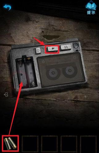16、重新来到柴房,点击左边桌子上的录音机,将【电池】和【磁带】(点击录音机上左边第一个按钮 )安装进去,并按播放键,得到线索:虔请魕娘子送子来。