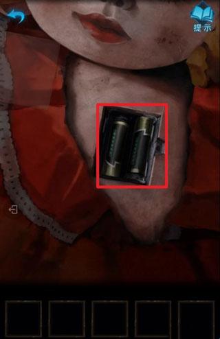 15、回到客厅,点击挂历下的柜子,打开下面的柜门,使用【铜指甲】打开洋娃娃身上的螺丝,得到【电池】。