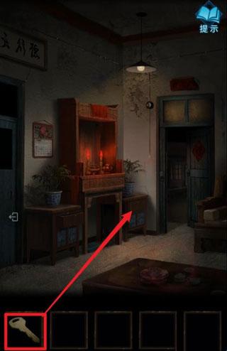 8、返回客厅,点击神龛右边的柜子,使用【钥匙】打开柜子,得到【老虎钳】。