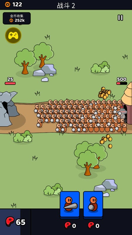 2、关卡内,需要通过生产粮食来招募士兵,对抗敌人,抢先一步击破对面的基地。