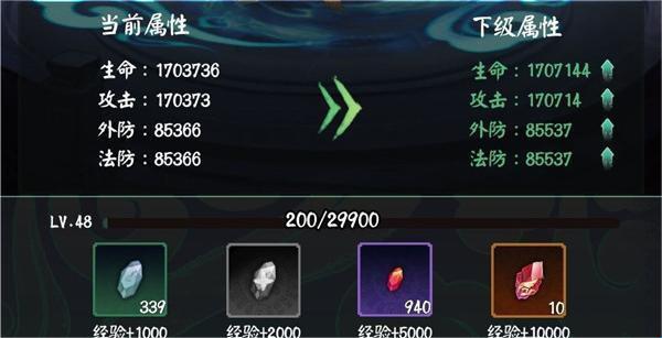2、根据经验所谈,各位着重培养那些红色和紫金品质的就可以了,其他的基本都是工具人。在培养的时候最直观的就是升级了,这个基本每个游戏里都有此功能,这里的升级方式就是使用经验石,在成功突破之后会有一定的属性加成。