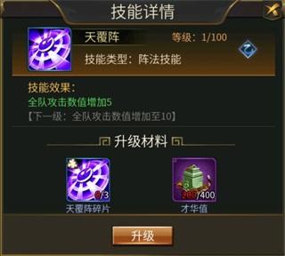4、升级技能需要消耗对应的阵法碎片和才华值,且等级越高需要消耗的材料越多。以天覆阵为例,从0级升级到1级需要消耗2个天覆阵碎片和200点才华值,从1级升级到2级需要3个天覆阵碎片和400点才华值