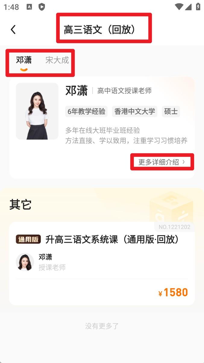 进入课程详情页可查看主讲老师、教学背景与班型安排,点击「更多详细介绍」获取完整介绍。