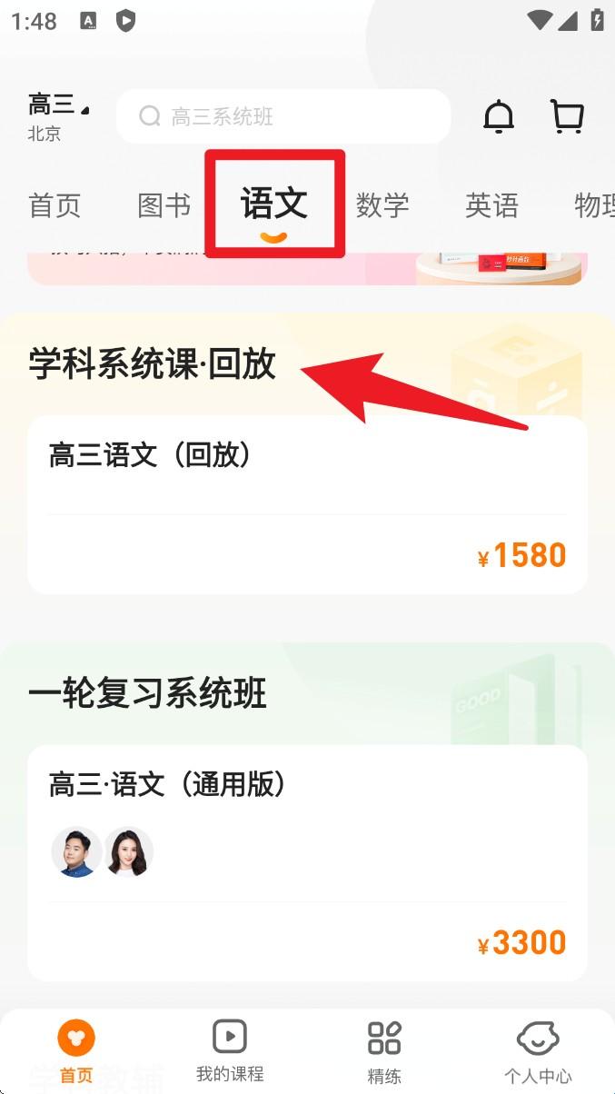 点击顶部学科导航栏切换至「语文」分类,下滑即可浏览高三语文课程及回放资源。
