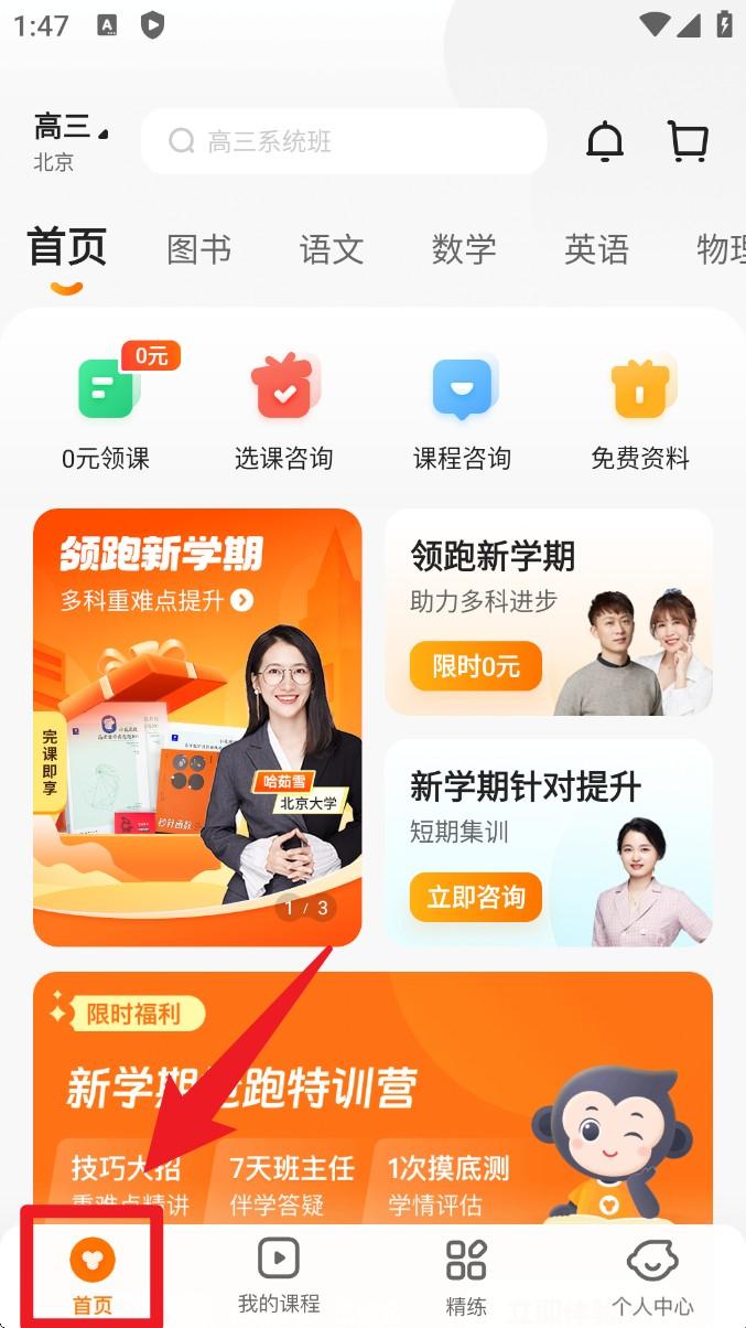 打开软件进入首页,可浏览课程推荐、限时活动及免费资料,点击底部页签随时切换栏目。