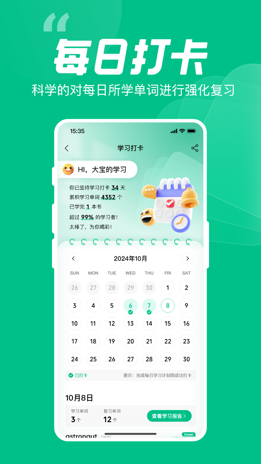 通过在线完成每天的单词学习打卡任务,帮助学生统计学习天数,培养良好习惯;