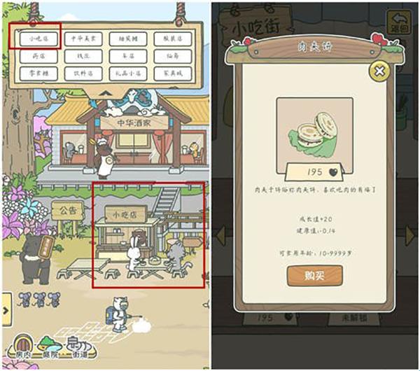 小吃店猪老板的小吃店可以买到肉夹饼,195颗爱心1份,可以增加20的成长值,1份肉夹饼降低崽崽0.14的健康值。崽崽10岁时才可以购买肉夹饼,因为肉夹饼的可食用年龄范围是10-9999岁。