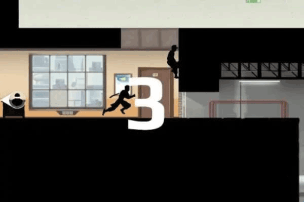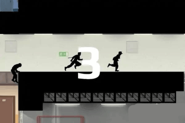 5、首先注意,主角现在这个位置的后面是一段加速的路,路的尽头是一个墩,也就是图中最左边那一点点高的东西,在这段路加速后差不多到墩的时候要向左划一下屏幕减速,然后跳刀墩上再起跳(图中的动作),去到前面那个人那段路,大概到那块公告牌的位置,向下划一下屏幕去到这关的第二个隐藏场景。