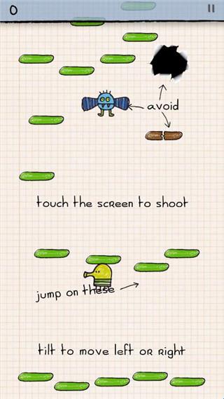 1、在游戏中玩家要让涂鸦弹簧小怪物不停地往上跳跃,在跳跃中要小心破碎的平台、移动的蓝色平台、黑洞、不明飞行物和坏人,途中有快速上升的火箭、竹蜻蜓、弹簧和弹簧鞋,宇宙版本有大火箭。