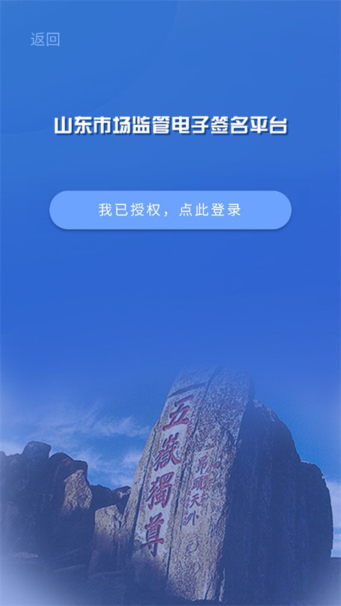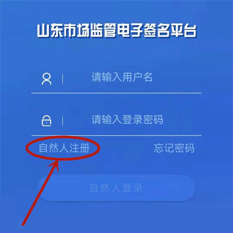 打开「山东省市场监管全程电子化」APP,并允许相关运行权限,进入主页面,点击「自然人签名登录入口」。