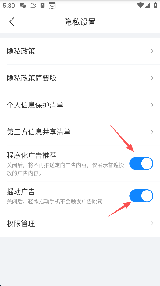 5、这样就关闭了“程序化广告推荐”和“摇动广告”。