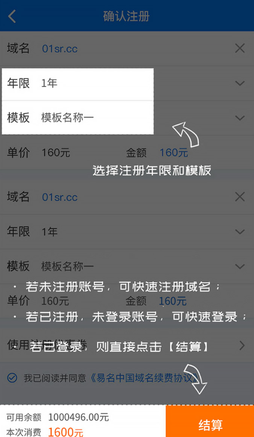 4、确认注册信息,若未注册账号则可以快速注册域名,若已注册但是未登录账号,即可快速登录吗,若已经登录,就可以直接点击结算。