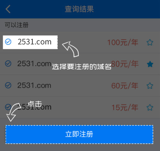 3、会跳转到查询结果页面,选择要注册的域名,点击立即注册。