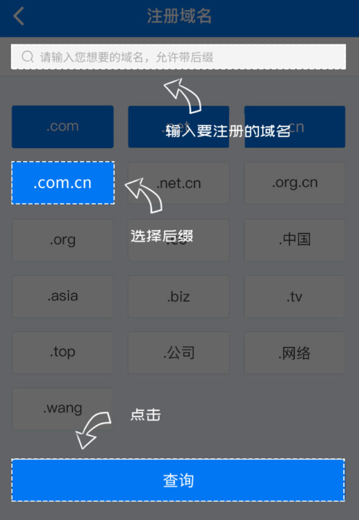 2、进入注册域名界面,输入要注册的域名,选择后缀,完成后点击查询。