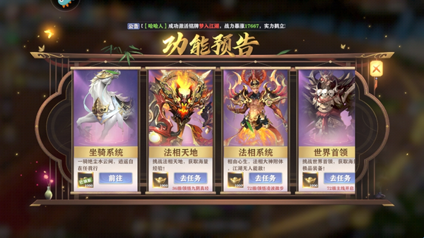 5、上古法相参战:战斗中可召唤上古大神法相协助作战,法相拥有强大技能与独特外观,瞬间扭转战局。
