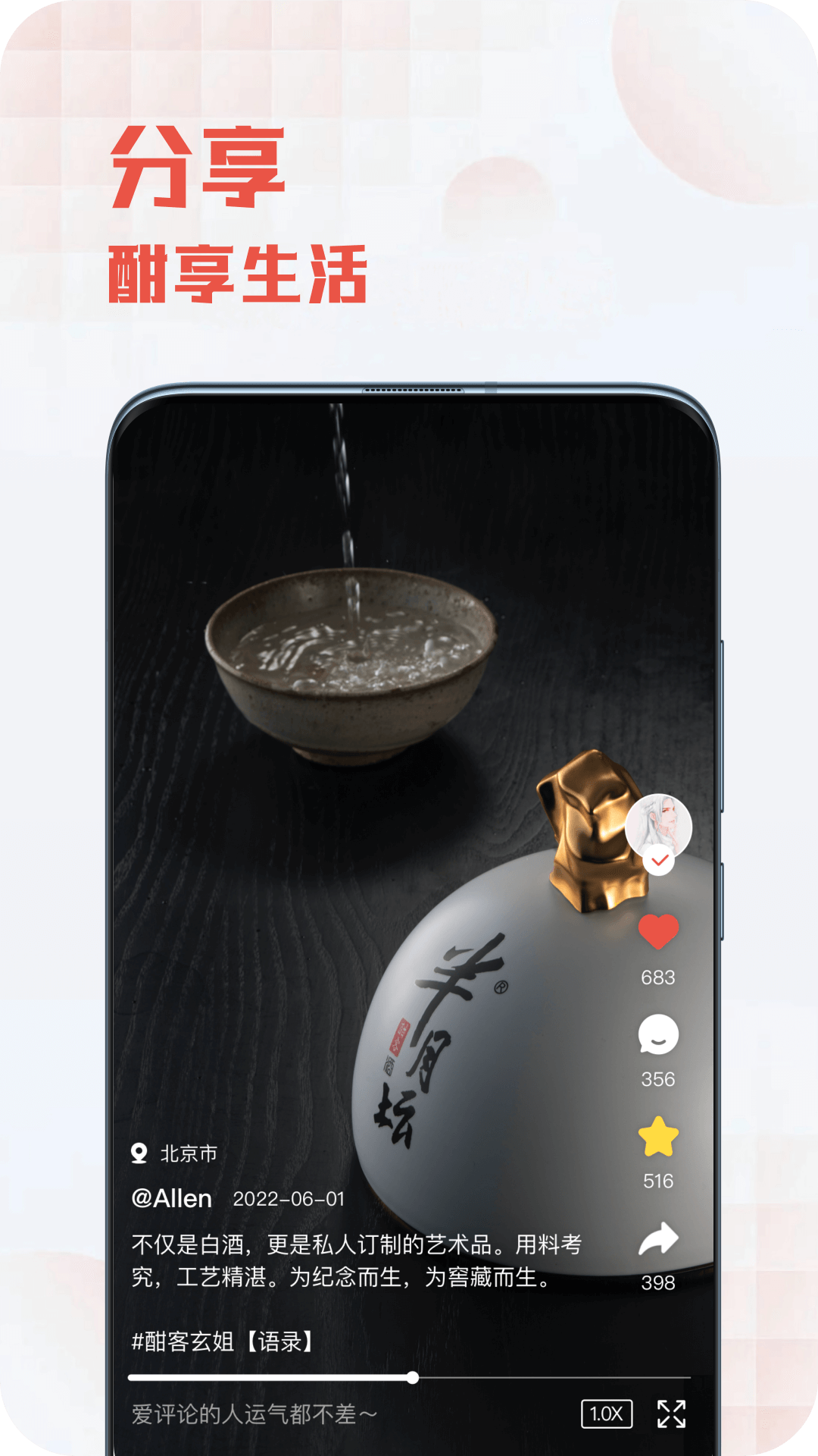 酣享是一款关于酒文化的社交软件。这里汇聚了来自天南地北的酒文化爱好者,在这里用户们可以一起聊酒、品酒、分享关于酒的各种文化知识和有趣内容。软件内还为用户提供优质的酒水购买服务,并且都是正品哦!快来下载发现更多乐趣吧。