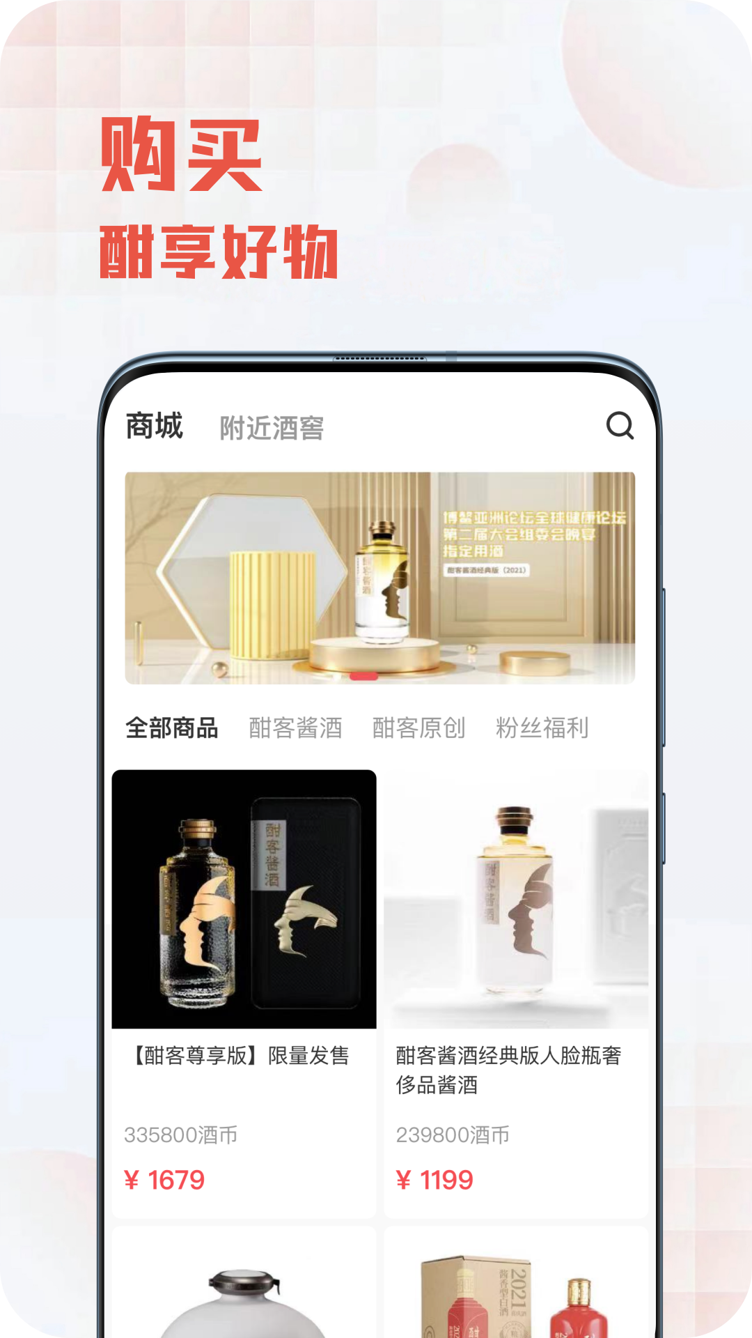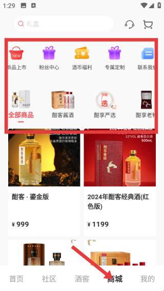 3、商城页面布局丰富,顶部新品上市等功能入口,覆盖粉盘、福利、定制等服务,商品区按酣客酱酒等分类。