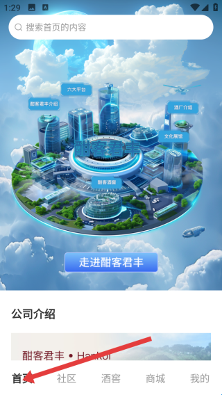 1、首页界面呈现3D科技感城市模型,有智能基本介绍等功能区,搜索栏方便找内容走进酣客君丰按钮引导了解品牌。