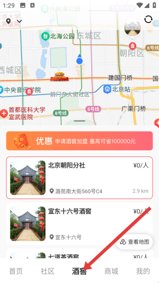 2、酒窖标签,可查看周边酒窖信息,地图清晰标注位置,像北京朝阳分社,宜东十六号酒窖显示距离、地址通过酒窖入口,轻松发现附近优质酒窖资源。