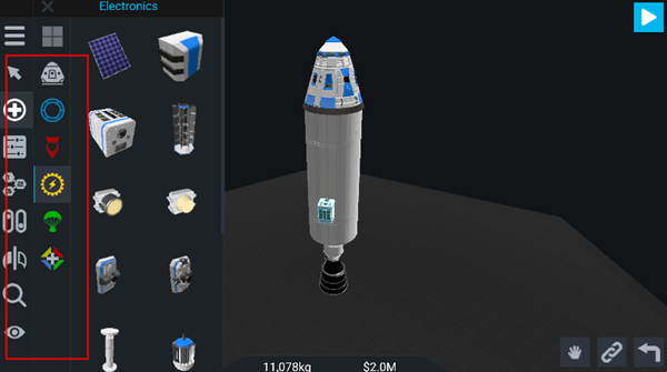 4、使用部件组装功能完整的飞船,如卫星需要指令舱、电池、燃料箱等,火箭则需分离器、燃料罐等。