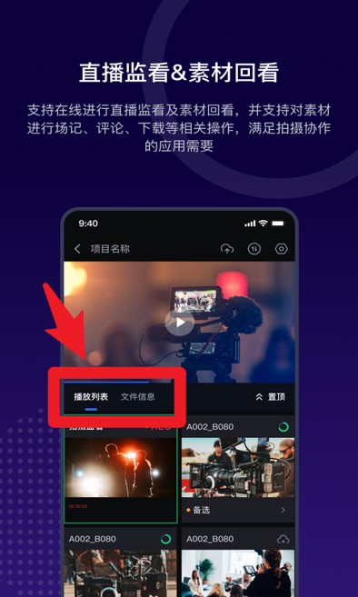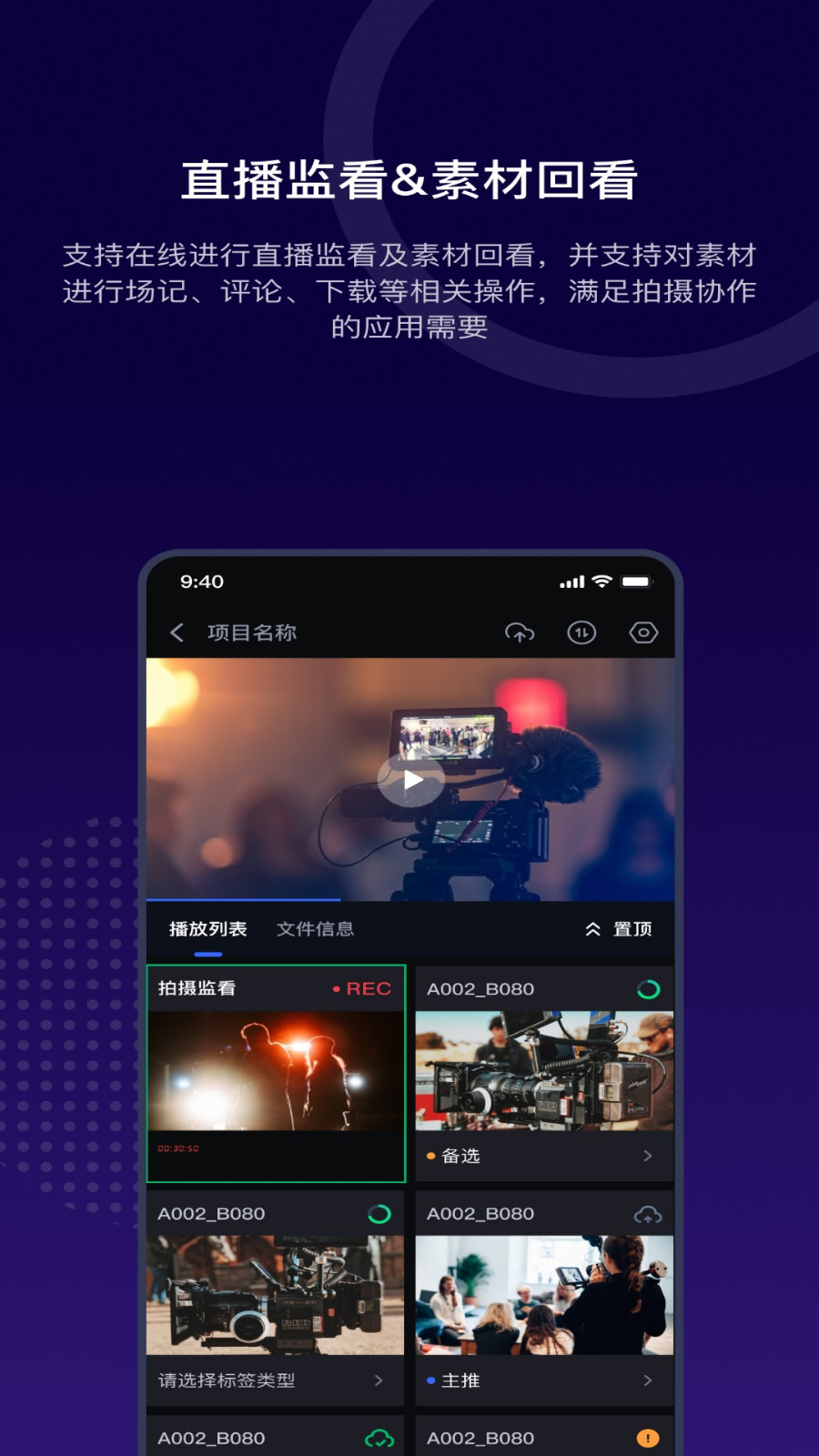 素材回看:支持将拍摄设备的拍摄素材自动上传至云端,在线回看已录制的素材并对素材进行场记、质量评价等操作。