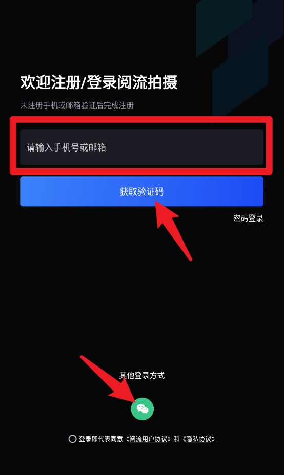 1、打开应用后输入手机号或邮箱获取验证码进行注册登录,也可选择微信等第三方方式登录。