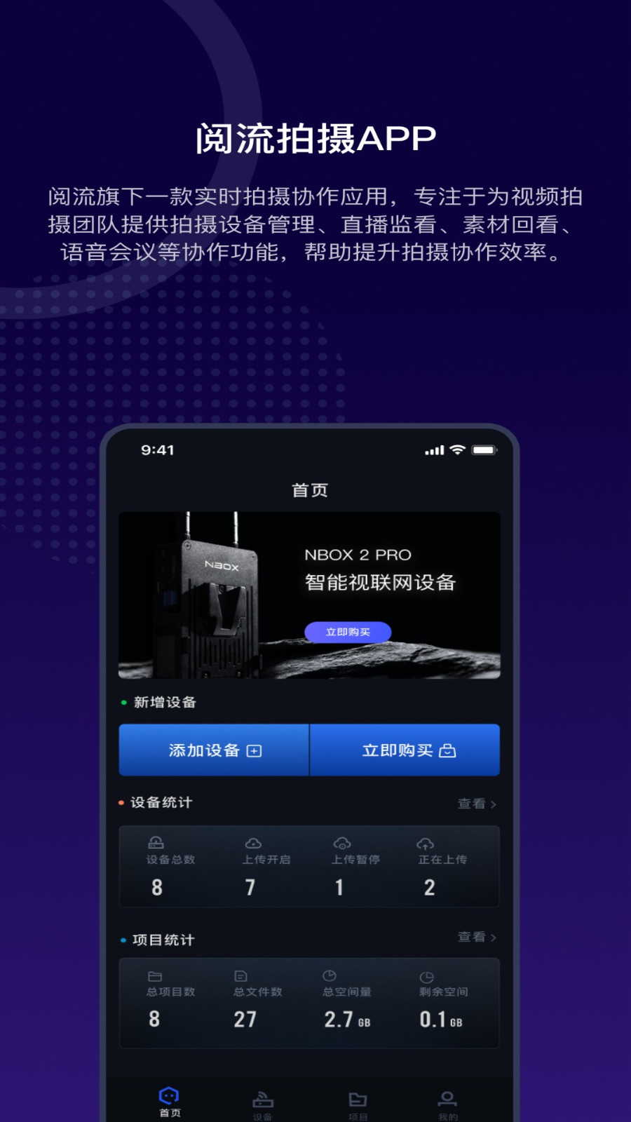 设备管理:支持连接并管理NBOX设备、运动相机、航拍器、图传设备等主流拍摄器材设备品牌和型号,满足多机位多类型设备的拍摄场景。