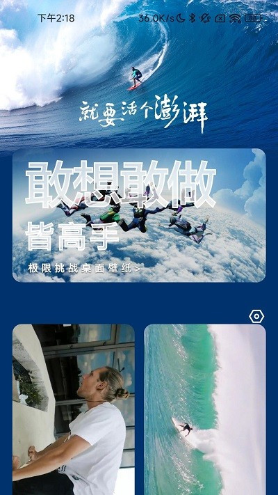 3、超多激情澎湃的充电壁纸,如高空跳伞,滑雪冲浪,攀岩运动等应有尽有。