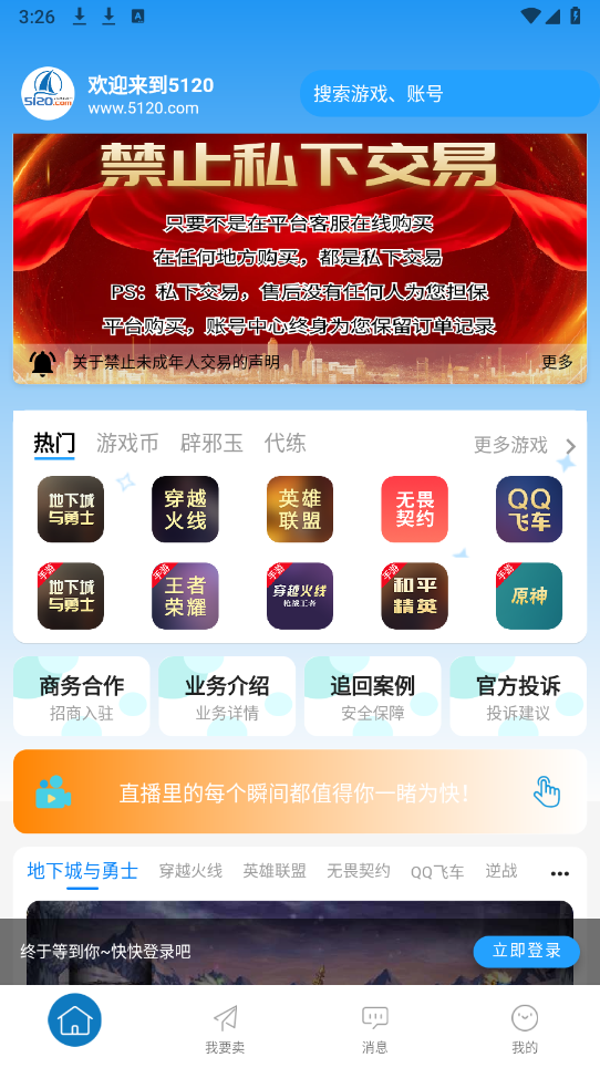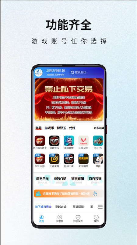 5120游戏交易平台官方版是一款专业的手游账号交易买卖平台。平台支持的游戏种类丰富,同时还支持游戏币、道具、账号等的自由交易。用户如果需要买卖账号,想要把闲置账号可快速变现,并且还有专业的客服保障你的交易安全,让用户可以放心使用!
