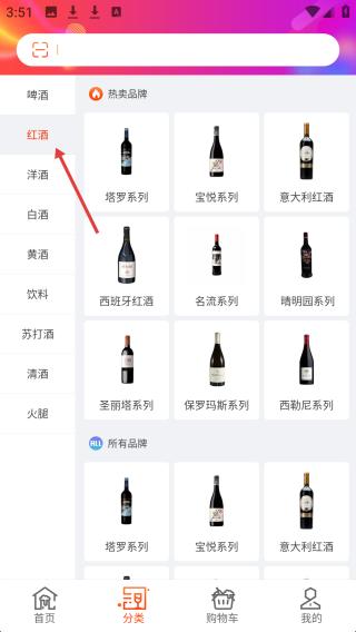 2、点击红酒分类页面,展示塔罗系列等品牌,从西班牙红酒到意大利红酒,提供丰富红酒选择。