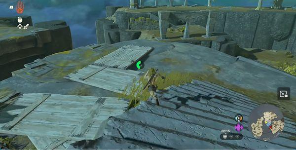 3、第一个过道坎,玩家首先开启究极手的功能,按住R键,将前面的石板移动到过道坎上,平放下来,然后玩家走过去就可以了。