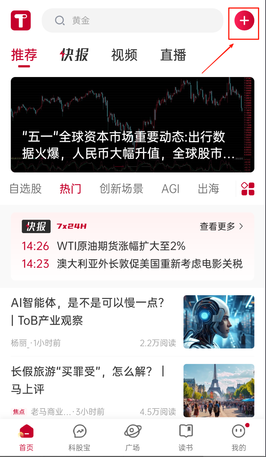 1、首页可以浏览各种新闻大事件,点击右上角的加号按钮,你也可以发文章。