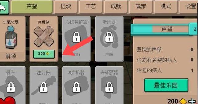 1、在游戏界面中可查看【声望】系统,通过积累声望解锁【过氧化氢】【创可贴】等医疗物品,逐步打造梦幻医院。