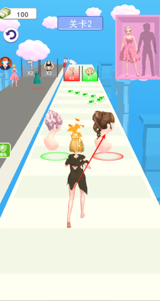 2、在赛道上收集发型、服饰等物品,依据关卡目标,给角色正确搭配这些物品,搭配越符合要求,得分越高。