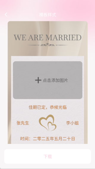 5、在模板样式中点击添加图片进行添加你们的婚纱照,然后进行修改文字中的内容,最后点击下载即可保存在手机中。